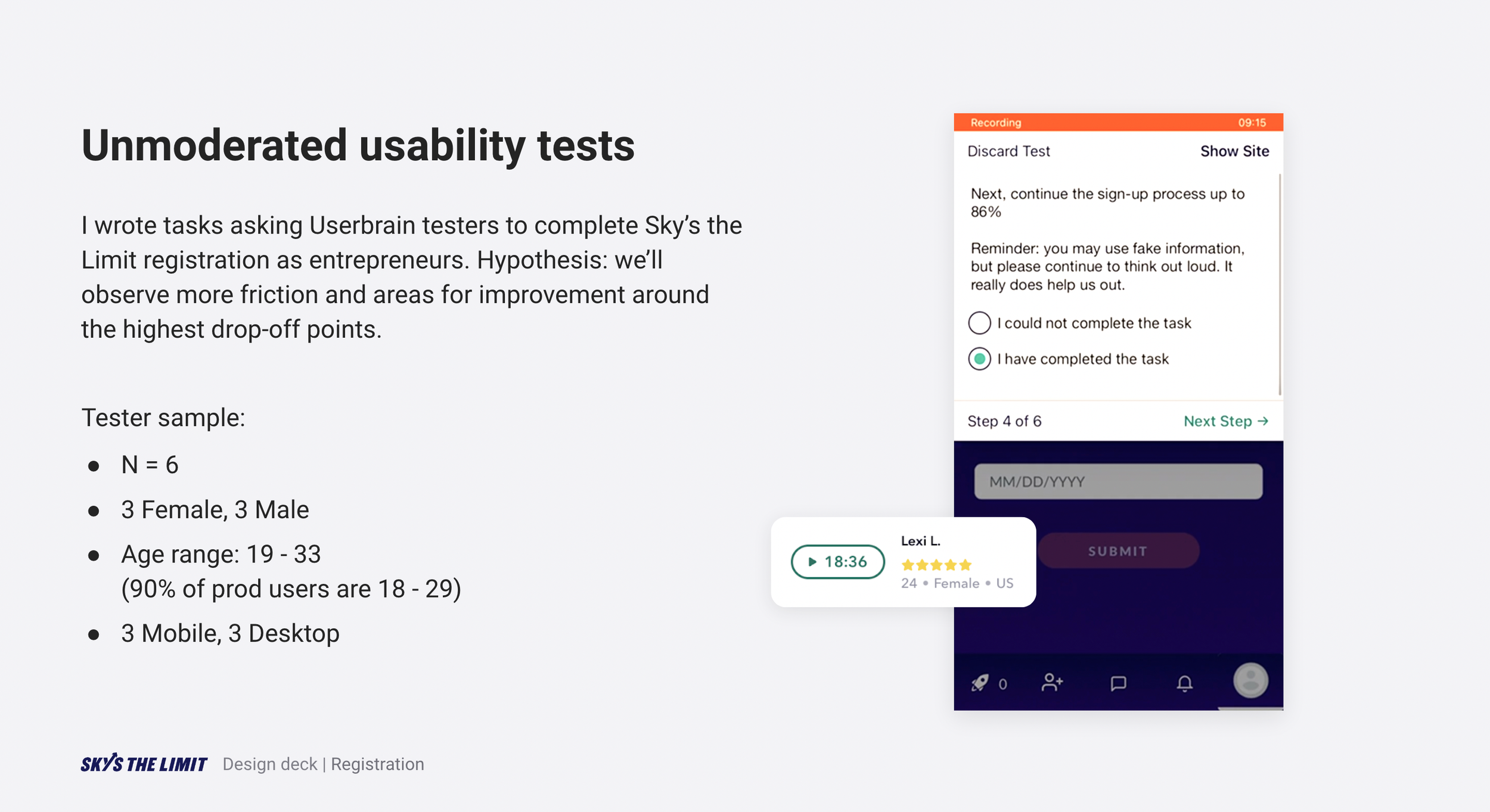 I enlisted our data analyst to identify drop-off points and estimate the average time spent on registration (using a three-month sample). Then, I planned and ran unmoderated usability tests β hypothesizing that we'd observe more friction around the highest drop-off points.