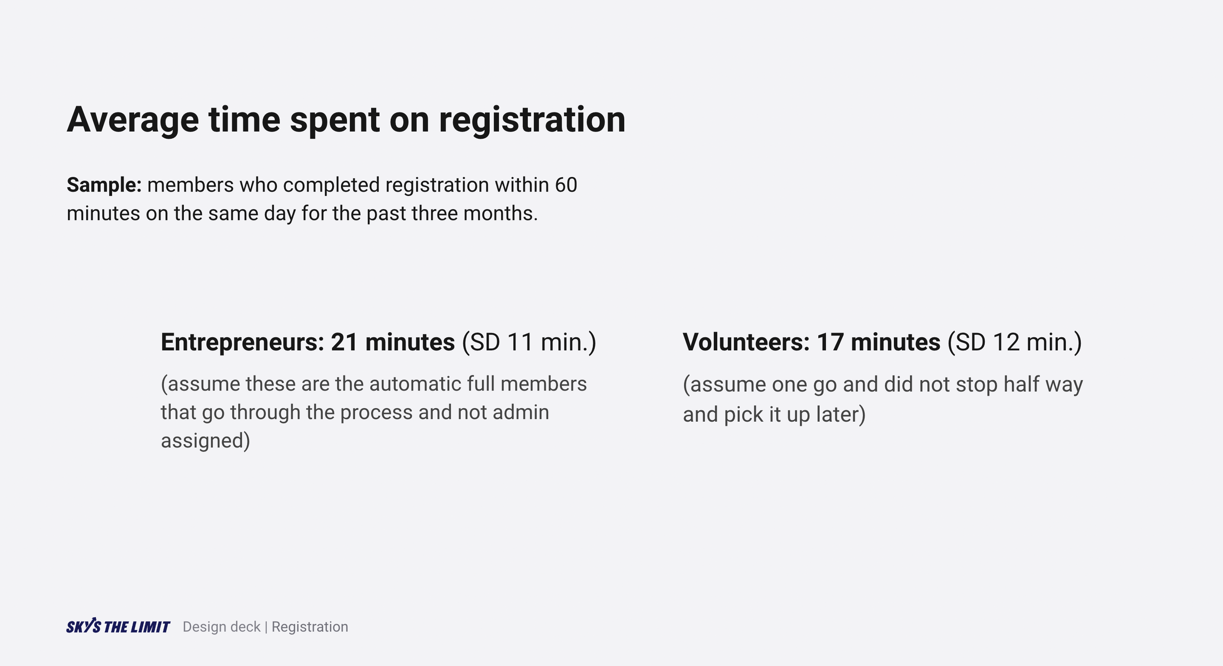 66% of testers voiced concern over the length of registration. Indeed, entrepreneurs in production spent an average of 21 minutes completing it when done in one sitting (SD 11 min.).