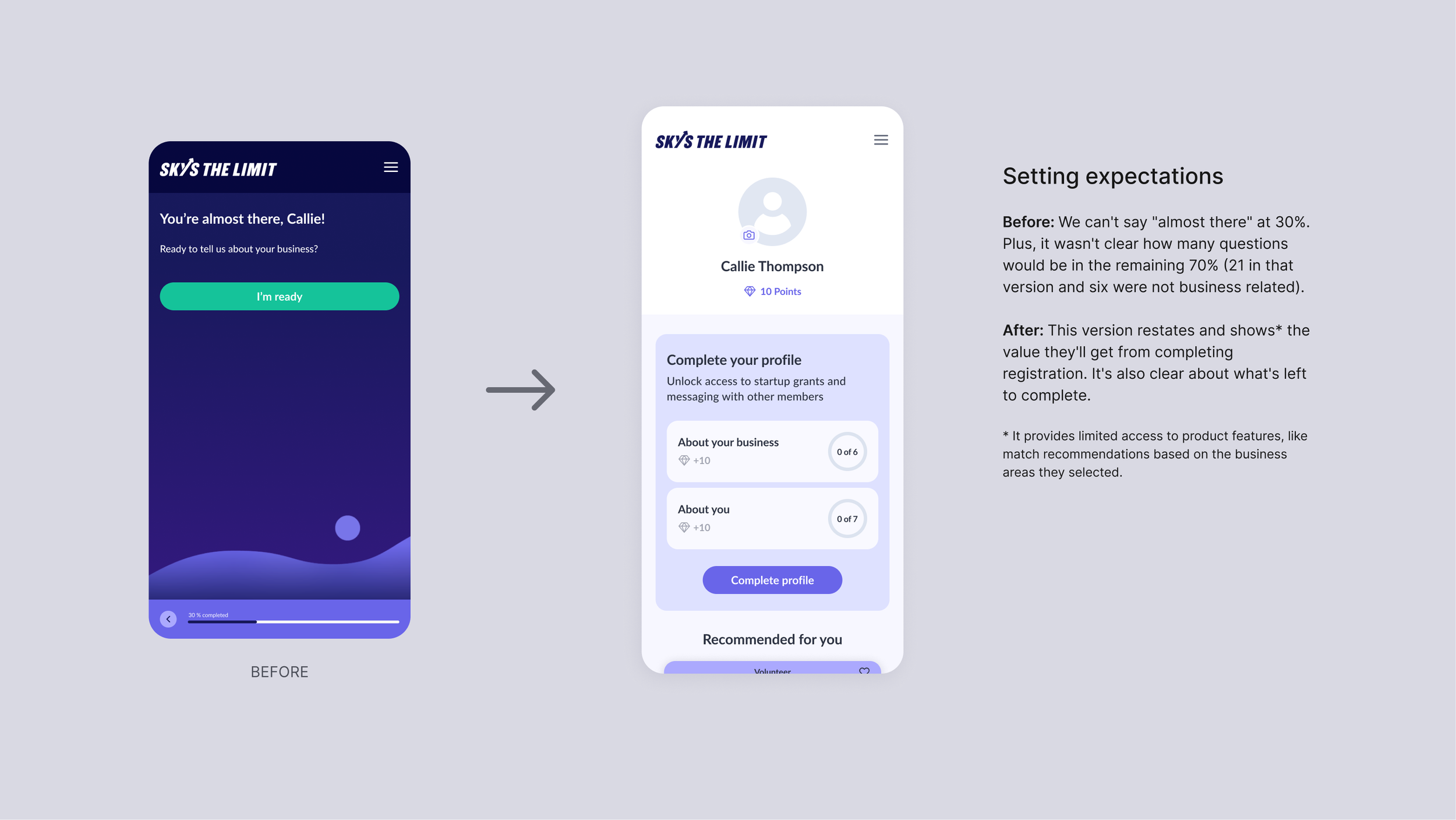 Considering research and stakeholder input, I cut unnecessary steps and prompts that could wait till later in the journey. For example, we removed the second-highest drop-off point, which asked users to review recommended profiles halfway through registration.